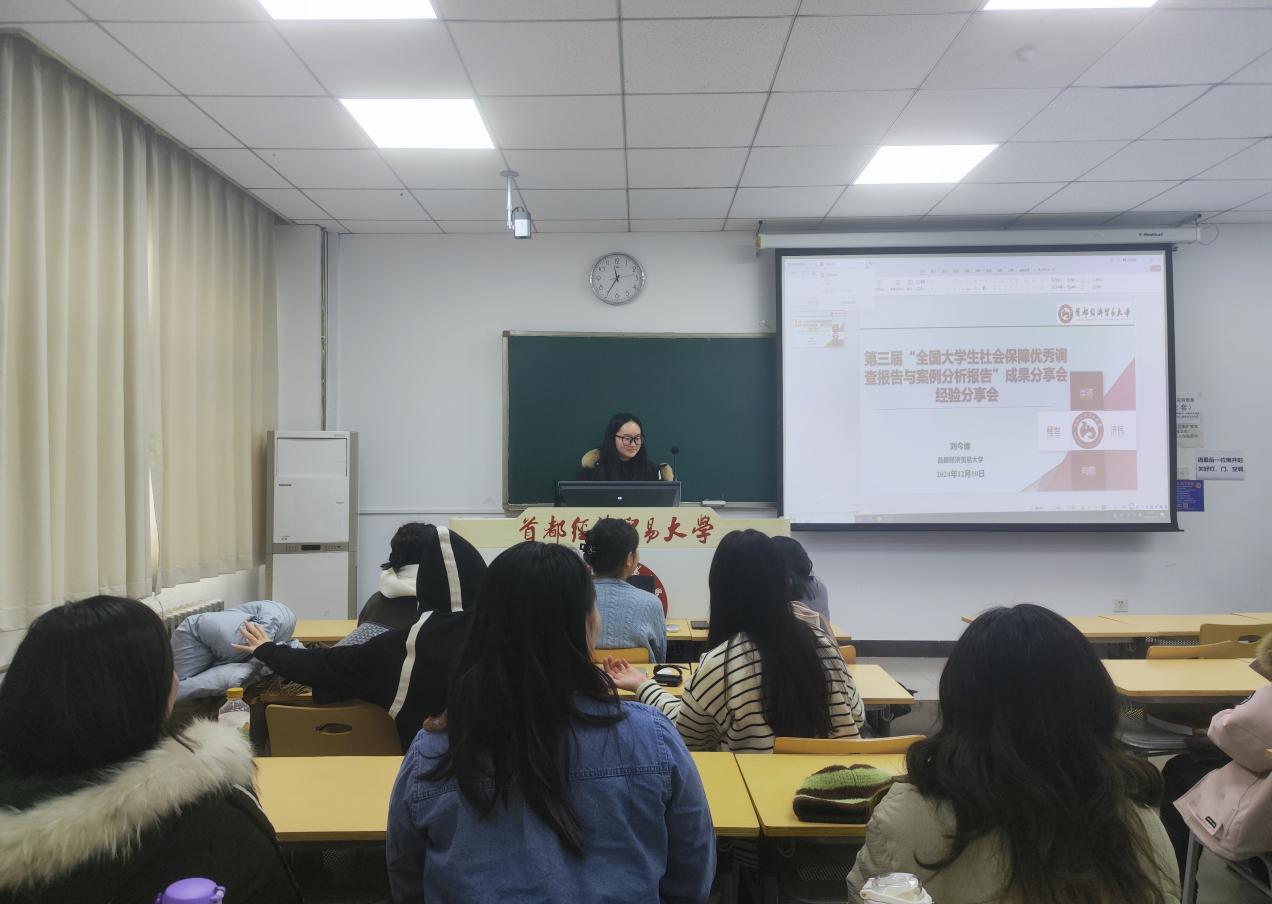 开展第三届“全国大学生社会保障优秀调查报告与案例分析报告”成果分享会的参会经验分享。本次活动由2023级硕士研究生刘今维同学汇报,她不仅带来了参会论文的汇报,还与在场的多位硕士研究生深入交流了宝贵的参会经验。