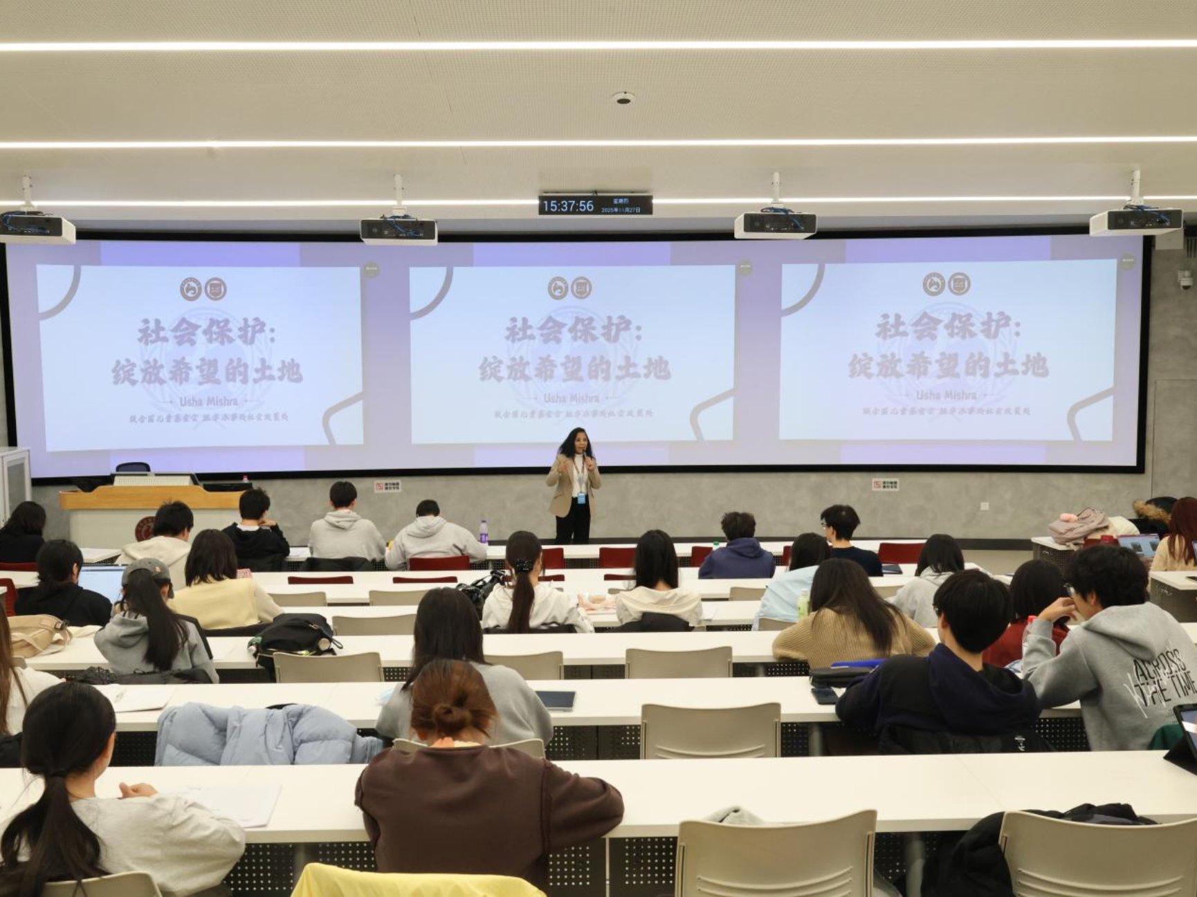 乌莎女士分享了人力资本在提高生产力和人口结构变化中的关键作用。她强调通过投资于教育(特别是0-3岁儿童早期发展)、培训和健康来发展人力资本,不仅能提高劳动生产率、促进经济增长,也是应对全球老龄化和技能短缺等人口挑战的根本解决方案。讲座现场气氛热烈,面对同学们的积极提问,乌莎进行耐心解答。