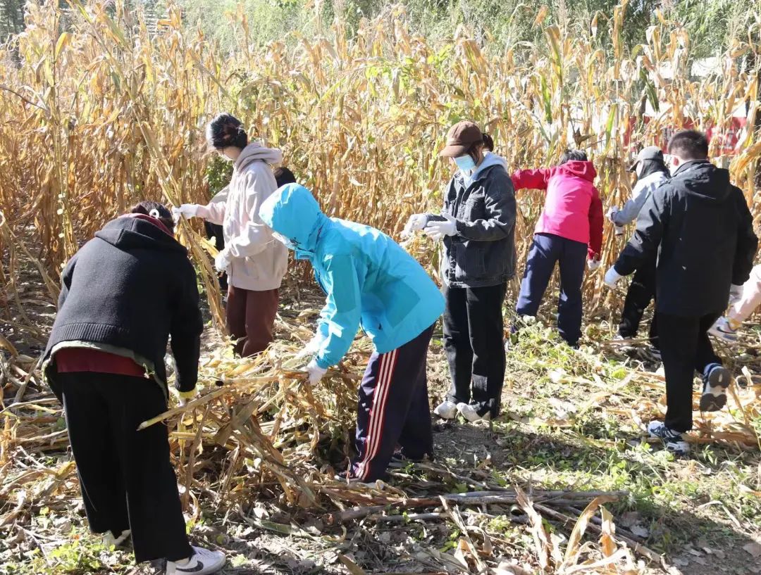 首先进行第一项农务劳动——割玉米杆,工作人员为大家仔细地介绍了如何安全正确地使用劳动工具,并分配了各小组的劳动任务。每组同学内部分工有序,各组同学之间暗自较劲,虽然风很大,但也没有吹散同学们劳动的热情,场面热火朝天,驱散了秋日的寒冷。