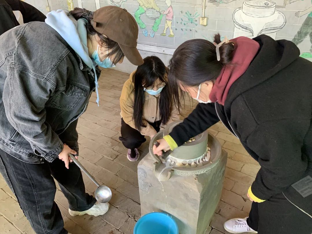 紧接着,同学们前往豆腐作坊,工作人员演示了煮豆浆、卤水点豆腐、豆腐压制定型等技术流程,这样一桶热豆浆凝聚成香气扑鼻的热豆腐。工作人员又向同学们演示了如何使用石磨这一传统工具磨豆浆。同学们兴致勃勃地投入到磨豆浆的劳动中,在看似简单的磨豆浆劳动中提炼操作技巧。都说“实践是最好的老师”,虽然最终每组豆浆的浓厚寡淡不同,但体会到了在一项劳动任务中,团队协作的重要性。见证了制作全过程后,工作人员将成型的豆腐分给同学们进行品尝,此刻的自制豆腐显得格外美味。