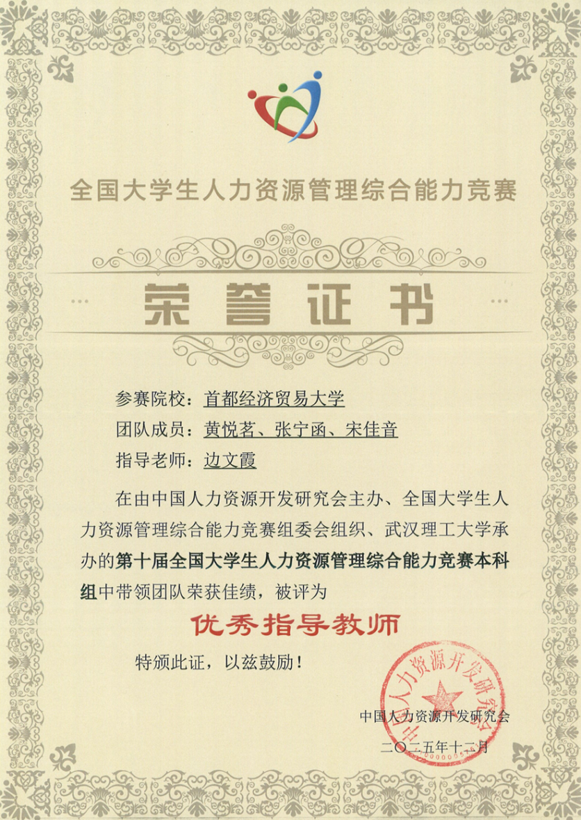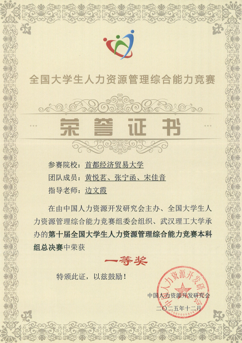 11月8日至9日,第十届全国大学生人力资源管理综合能力竞赛总决赛暨高峰论坛在武汉理工大学举办,全国117所高校的600余名师生、业内专家学者赴会。由2023级人力资源管理实验班黄悦茗、张宁函、宋佳音同学组成的蜜桃视频 代表队在决赛中获得本科组一等奖,边文霞老师获得优秀指导教师称号。