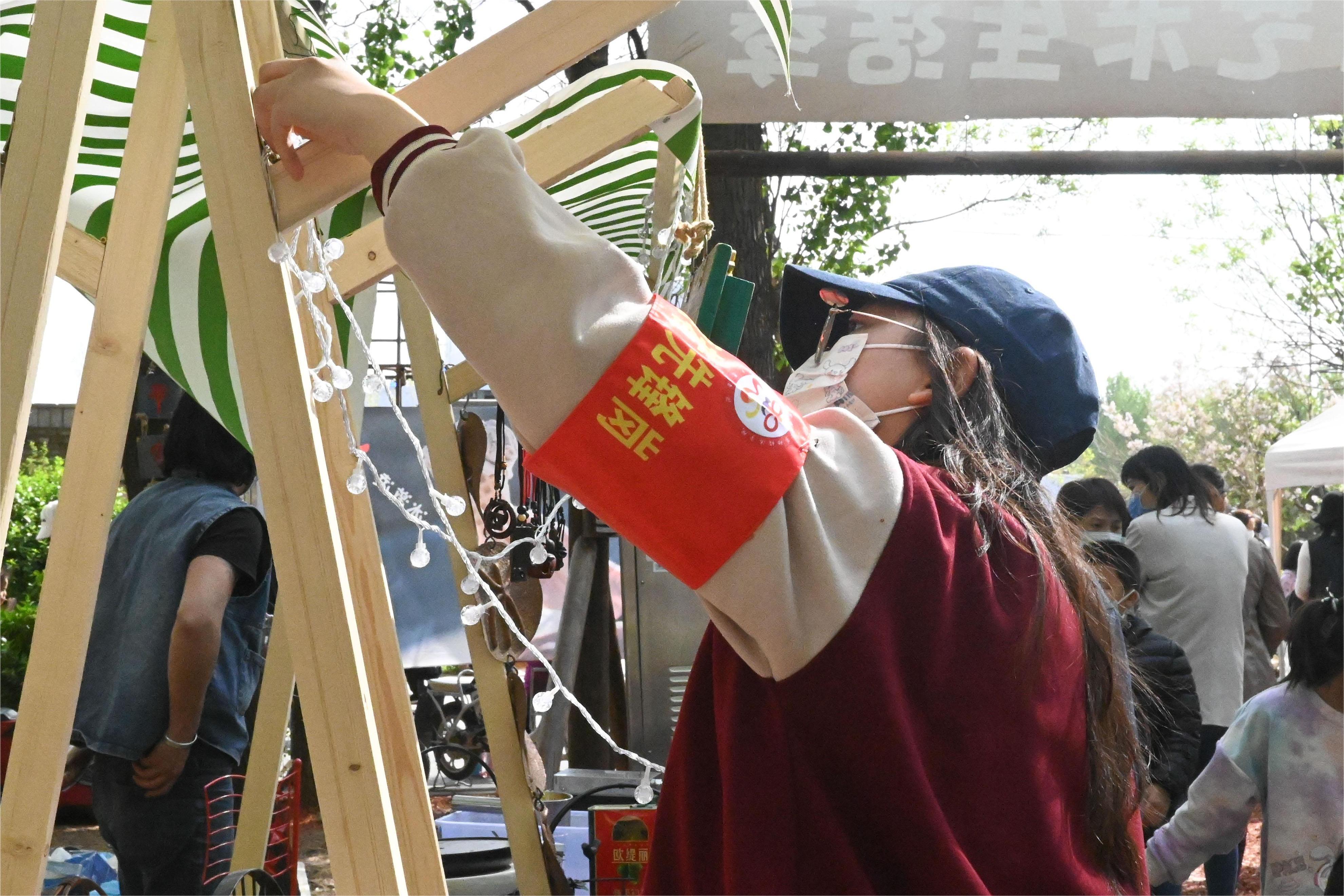 下苑村艺术市集上凝聚了52个摊位,其中80%是兴寿镇的驻村艺术家、设计师和手作人,用果蔬厨余堆肥制作成“颗粒花肥”、用虫咬和过熟的草莓染成的粉丝巾等,他们带着原创手作的艺术品、美食、服装、玩具、工艺品等,吸引了众多游客。蜜桃视频 志愿者搭建起劳经专题摊位,通过一件件文创,向游客普及红色劳动历史,介绍专业社工在下苑村多元治理中发挥到作用,让劳动学科融入市集。同时劳经志愿者的身影出现在市集到各个角落,布置摊位,引导游客,悬挂夜灯,疏导交通,帮助行动不便的老人度过坑洼路段,协助市集负责人搬运场地物资。每一位志愿者犹如一个齿轮,通过自己的劳动助力市集整体运转有序。