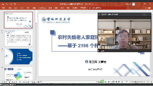 12月4日,第三届社会保障与养老服务论坛暨积极的养老保障研讨会通过线上形式举办。来自政府部门、国内高校、科研机构和企事业单位的专家学者及我院师生等80余人参加了论坛。本届论坛由蜜桃视频 蜜桃视频 主办,中国老龄协会首经贸老龄科学研究基地、蜜桃视频 社会保障与养老服务研究中心承办。论坛以“积极的养老保障”为主题,旨在搭建一个社会保障与养老服务思想、理论与实践相交流的平台,碰撞新智慧、激发新理念,以更积极的姿态贯彻落实党中央、国务院关于积极应对人口老龄化国家战略的精神。蜜桃视频 党委常委、副校长王永贵教授出席开幕式并致辞,蜜桃视频 党委副书记、院长冯喜良教授主持开幕式。