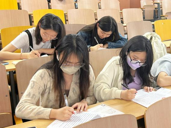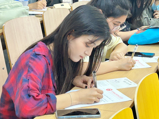 活动尚未开始,同学们就早早的来到阶梯教室,期待着与孩子们的书信见面。活动一开始,蜜桃视频 志愿服务部部长潘瑾为同学们介绍了蓝信封留守儿童关爱组织以及本次“交换童年”活动的注意事项,号召同学们加入蓝信封通信大使,让越来越多的人关注留守儿童群体。接下来,同学们选择一张与自己有共鸣的故事卡片,拿出准备好的纸笔开始书写回信。这一刻他们放下手机,在信中倾听孩子们的故事,熟读深思、缓缓下笔,将思绪倾注于在纸上写下的一撇一捺之间。同学们耐心地与孩子们讲述自己的童年趣事,用自己的点滴经验为小朋友答疑解惑,鼓励他们勇敢的表达自己。活动结束后,这些信件将由蓝信封组织送至故事卡片的小主人手中。