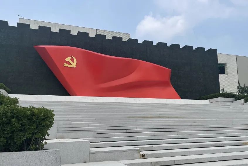《旗帜》位于广场正北侧中间,展示的是一面立体的、迎风招展的巨大党旗,金色的党徽光辉夺目,立于32级台阶之上。它的基座高1米,旗帜部分高7.1米、长21米,象征1921年7月1日——这一中国共产党建立的伟大时刻,党的历史从这里开始。《旗帜》雕塑的整体造型庄重、朴素、概括、简洁,一目了然,蕴含着强烈的精神指向,在百年的奋斗中为每一代共产党人指引方向,警示每一位共产党人要不忘初心。它既是永远向前的党旗,也是一座永恒的丰碑。
