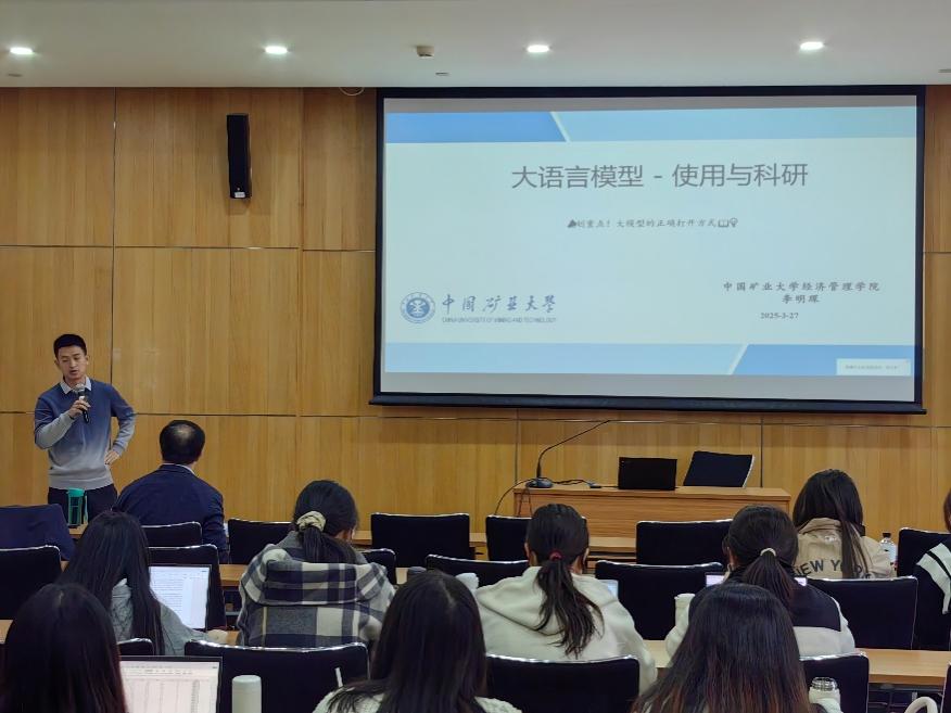 3月27日下午,蜜桃视频 在博远楼4号报告厅举办“大语言模型助力科研论文与项目撰写”讲座。特邀中国矿业大学经济管理学院李明琛副教授担任主讲人,蜜桃视频 党委书记何勤教授、副院长苗仁涛教授,多位教师和硕士、博士研究生参会。讲座由苗仁涛主持。