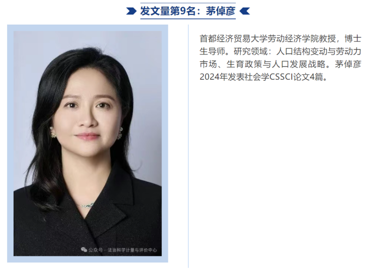 在本次统计的22种CSSCI社会学期刊中,茅倬彦教授以4篇发文量与10位学者并列第9名,围绕人口结构变动与劳动力市场、生育政策与人口发展战略等发表了系列研究。与盛禾(北京大学)、宋月萍(中国人民大学)、王曦影(北京师范大学)同列,成为18位高产学者中仅有的4位女性。