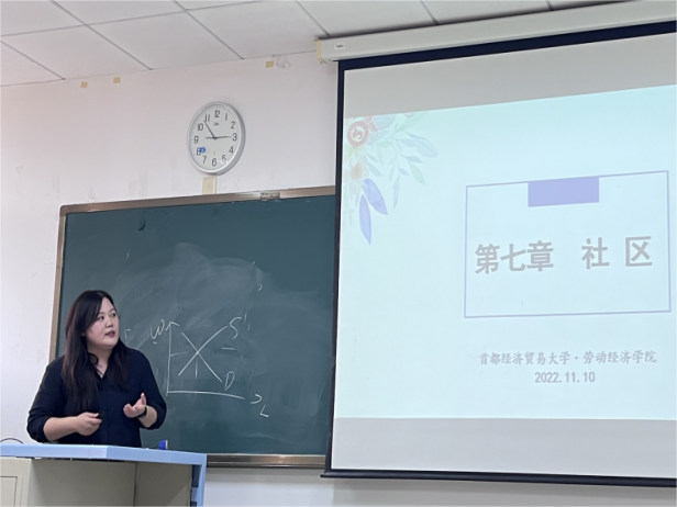 在教学展示和竞赛环节中,毛宇飞聚焦“总报酬模型”这一主题,采用问卷调查、视频案例等多种手段生动而详细地介绍了相关概念的内涵、特征及其应用。李红霞以动画影视作为媒介引入自我概述、自我形成与管理、自我防御机制与管理的知识。王晓霞带来医疗保障模式的知识点分享,介绍了社会医疗保险、全民医疗保险、商业医疗保险和储蓄医疗保险四种模式,以相应国家为例加以分析。毛艾琳选取职业病作为展示主题,讲解我国职业病界定的四个关键要素,进而引出我国职业病目录及现存问题分析。刘潇将养老保险的筹资模式作为课堂展示的主题,分析不同养老保险筹资模式的特征及优缺点。张立龙选取多元回归模型的统计检验中拟合优度这一知识点进行教学演示,逻辑推导拟合优度的求解方法。赵羚雅从影视剧《人民的名义》出发,讲解了公共管理者的角色变异。李竞博以“为什么要学习人力资本?”这一问题展开课程讲解,展示人力资本的具体构成与演变。徐凤辉从社会实际问题出发,选取内部劳动力市场与薪酬这一知识点进行课程展示与分享。常成以两个案例引出“社会流动”这一课堂主题,以社会学的专业视角分析现实中的社会流动现象,采用图表形式直观展示分析过程,鼓励培育学生的问题意识。曹家宁以现代贴近生活的网络社区为例,引入社区这一主题,从社会学的专业视角分析社区的特征,最终界定社区的概念。魏文一从学生视角出发,以“什么是社会学?”这一经典问题引出教学主题,结合多名学者的观点,引经据典,从多个角度剖析社会学的深刻内涵。