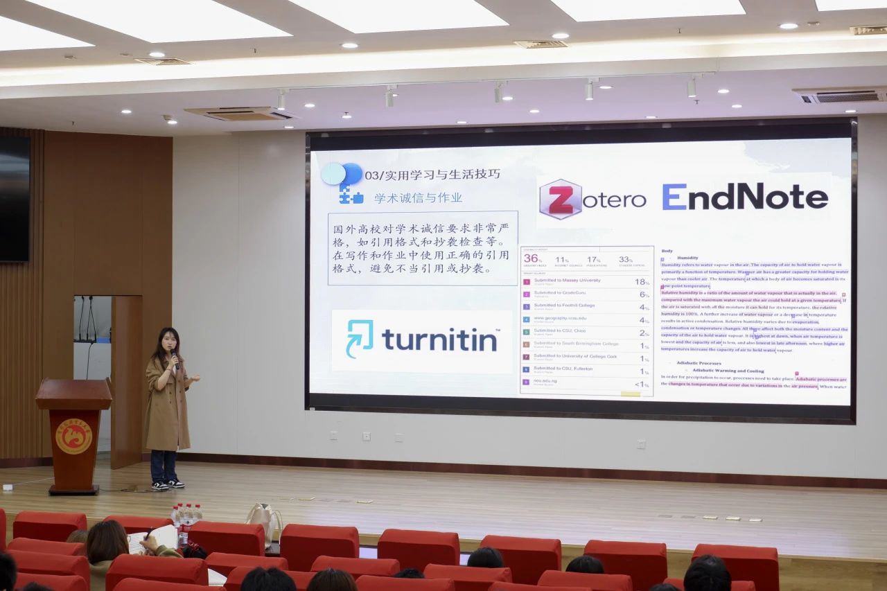 梁思佳学姐则侧重于分享海外学习和生活的经验。她首先分享了自己留学的动机,包括拓宽专业视野、增强职业竞争力、获取更广泛的资源和机会以及积累人脉资源。她建议同学们通过自我评估来确定是否适合留学道路。接着,学姐分享了海外生活的实用技巧,例如重视学术诚信、避免抄袭并正确引用文献,积极利用学术资源如电子书和期刊,参与校园支持活动和文化沙龙以及利用校园提供的1对1咨询和交流活动等人文关怀服务。
