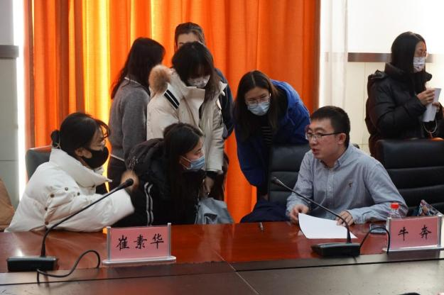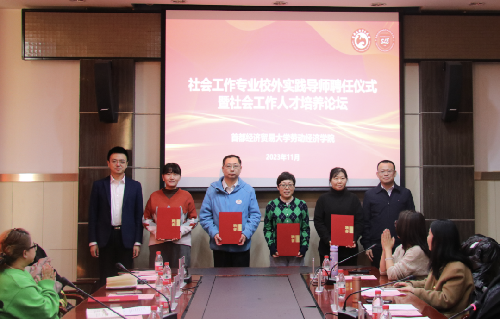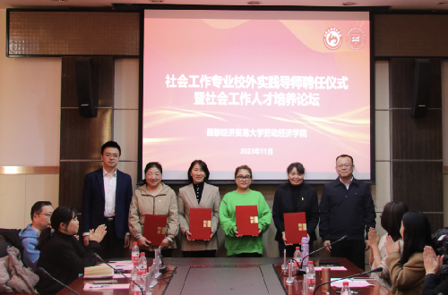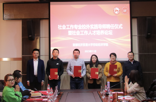 社会工作系系主任吕新萍主持聘任仪式,范围宣读校外实践导师名单,冯博、刘博涵为导师颁发聘书。