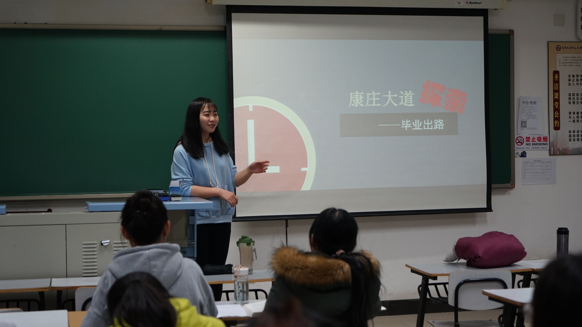 3月22日晚,蜜桃视频 2016级新生于各班晚自习教室,展开了以“生涯规划坊”为主题的新生成长课堂。此次新生成长课堂由各班班助主讲,对考研、出国、就业等三种较为广泛的毕业走向进行介绍,为同学们普及了选择各种就业走向可能遇到的问题。