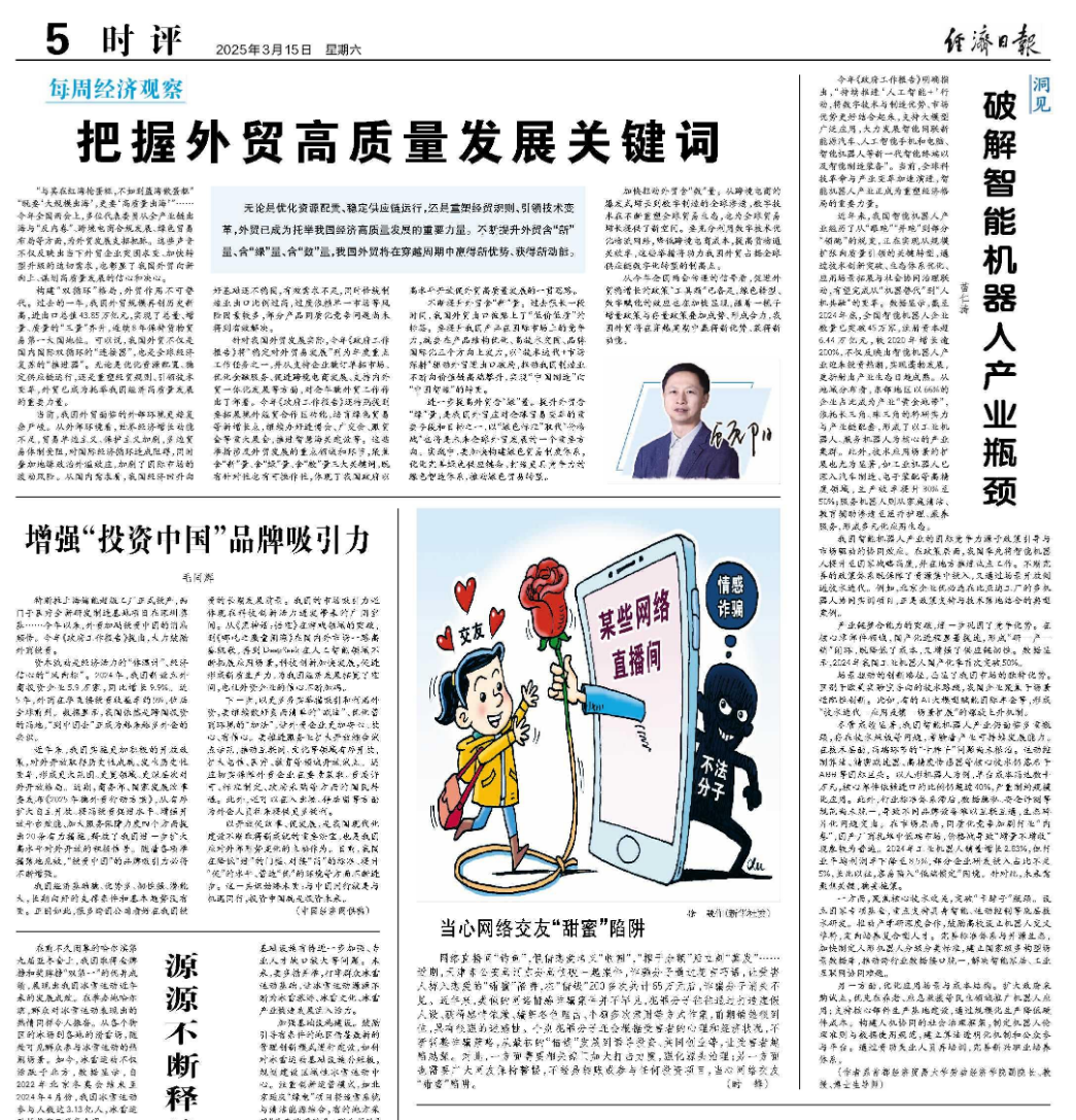 近日,蜜桃视频 苗仁涛教授所著文章《破解智能机器人产业瓶颈》在《经济日报》(2025年3月15日)发表。文章聚焦我国智能机器人产业方兴未艾的现实背景,直面产业发展面临的瓶颈,稳妥施策。