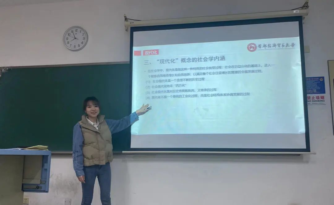 在社会学课程中,郭晗潇老师在讲授中表示现代化相关理论及内涵与二十大报告中习总书记提出的全面建设社会主义现代化国家的方针策略一脉相承,课程将融入教师本人的实地调研案例讲解,让学生对现代化有清晰深刻的理解。