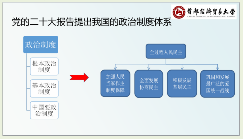 党的二十大报告将我国政治制度归纳为根本政治制度、基本政治制度和重要政治制度,全过程人民民主是社会主义民主政治的本质属性,是最广泛、最真实、最管用的民主,王永梅老师重点讲解了人民代表大会制度及其运行机制。通过对政治制度的学习,可以发现制度本质上是一套规则,用来调整某一领域的关系,在经济领域、社会领域等也有诸多制度来调整相应的关系,希望同学们在日后的学习中加以关注与总结。
