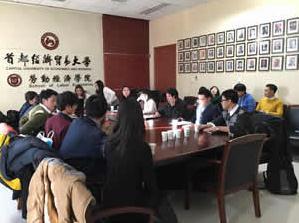 2015年11月26日下午在博纳楼229会议室,日本立命馆大学刘庆红教授一行与我院师生共同交流联谊。参与此次交流会的有日本立命馆大学刘庆红教授及6名日方学生,蜜桃视频 院长冯喜良教授,学院主管教学工作的副院长范围副教授,学院党委副书记丁志艳老师、劳动与社会保障系的张成刚老师以及13级人力资源管理实验班和13级劳动与社会保障班的部分同学。中日双方共有近30名师生参加交流会,就中日文化问题进行讨论学习。