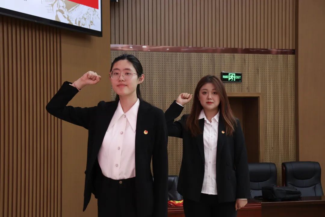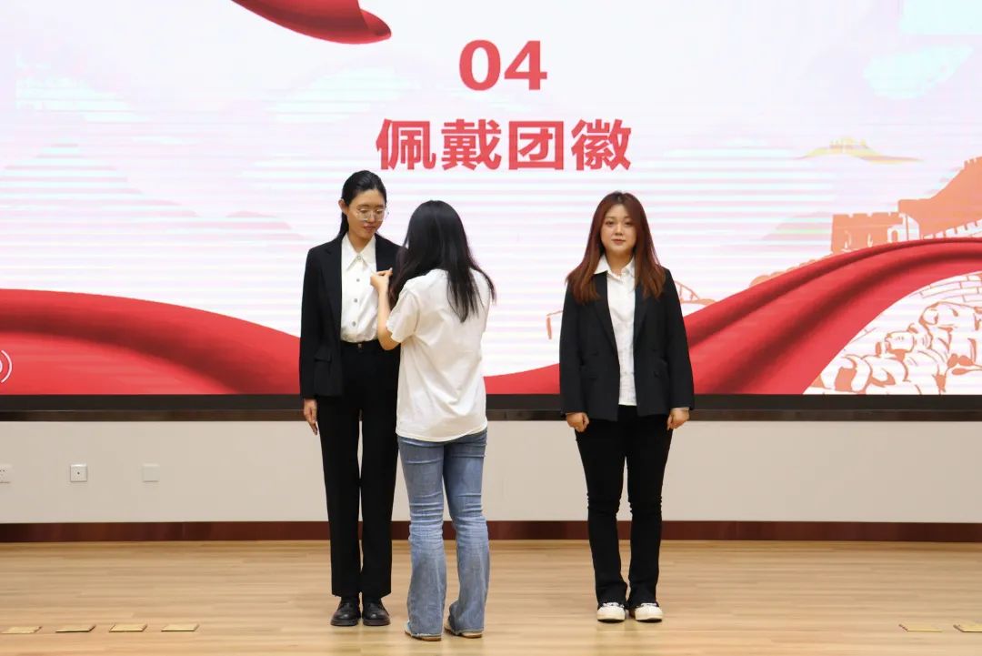 朱佳颖宣布新团员名单,并为新团员佩戴团徽。2020级劳动关系班团支部李玥潼、2021级1班团支部常润林等2名同学光荣的加入了共青团。