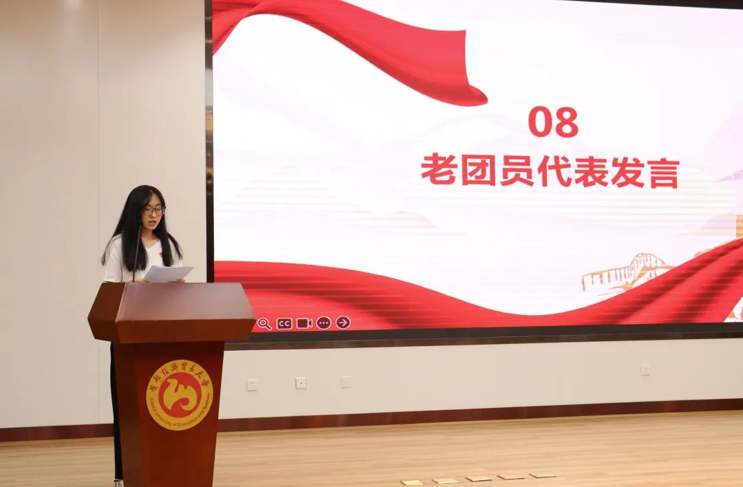 老团员代表张佳智发言。她认为,团员要树立共产主义远大理想,培育和践行社会主义核心价值观,深刻学习并遵守团章,团结带领身边青年一起成长,争做一名合格的共青团员,并勉励大家以执着的信念和过硬的本领来成就自己的出彩人生。