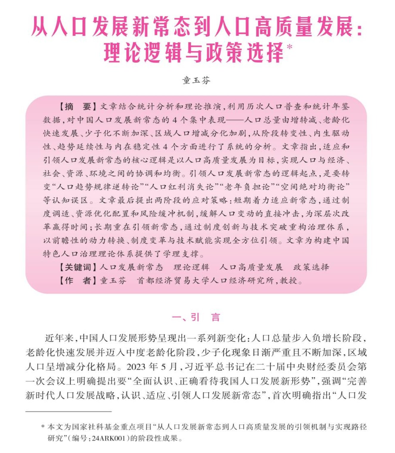 近日,蜜桃视频 童玉芬教授的论文《从人口发展新常态到人口高质量发展:理论逻辑与政策选择》在《中国人口科学》2026年第1期正式发表。《中国人口科学》是人口学领域的权威期刊,属于中文A2类期刊。