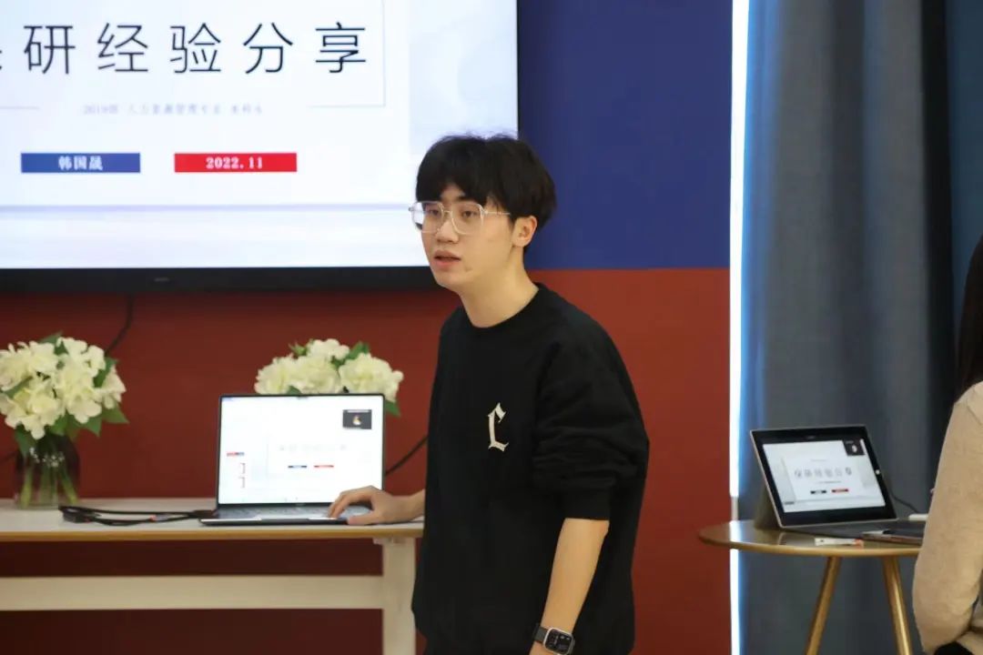 韩国晟即将攻读劳动经济学研究生学位,他用大学本科期间的丰富经历向同学们展现了榜样力量。谈到保研所需基本条件时,韩国晟着重提到了占比最大的学习成绩的重要性,并指出了三个重要方面,即“学习成绩 科研创新 综合能力”。在韩国晟学长的分享中,同学们深刻感受到了综合能力以及全方位发展的重要性,并能够以此树立自己的目标。