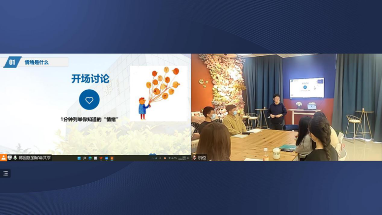 首先,邓听组织同学们进行开场讨论,让大家列举自己所知道的情绪并引出十一类情绪词汇,使同学们更好地理解情绪是什么,科普了情绪的产生涉生理生化活动,并指出学会管理情绪属于同学们大学期间重要的发展任务。