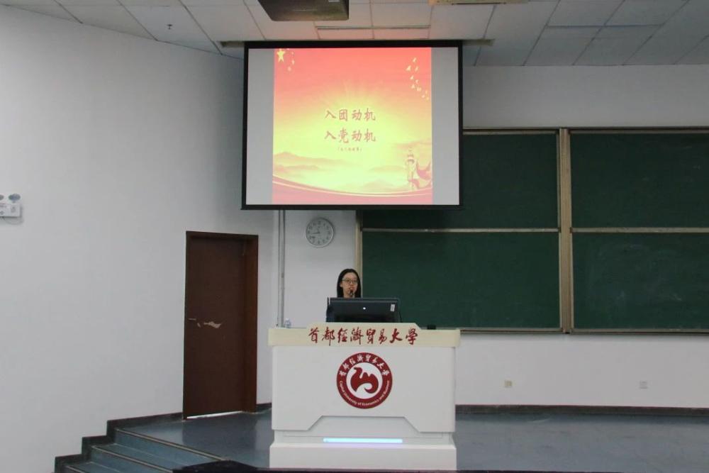 在入党教育中,郭英以“为什么要入党”为切入点,教育同学们要端正入党动机,提高政治觉悟、思想觉悟,并推荐了红剧《觉醒年代》,图书《马克思靠谱》《顶天立地谈信仰》,鼓励同学们在书里了解马克思,理解共产主义信仰,寻找自己关于信仰的答案。郭英简要回顾了党的百年奋斗史,诞生于民族危难之中的中国共产党,不忘初心、牢记使命,带领中国人民完成了新民主主义革命、社会主义革命,开辟了中国特色社会主义道路,创造了人类社会发展史上惊天动地的发展奇迹。到本世纪中叶时,在座的同学们正处于年富力强的人生鼎盛时期,期望大家珍惜这样的历史际遇,不负时代、不负韶华,立强国报国志,做奋斗经贸人,奋力书写为中国式现代化挺膺担当的青春篇章。接下来,郭英详细解读了申请入党、推荐优秀团员作入党积极分子、推荐优秀团员作党的发展对象、成为预备党员及预备党员转正的全部流程。