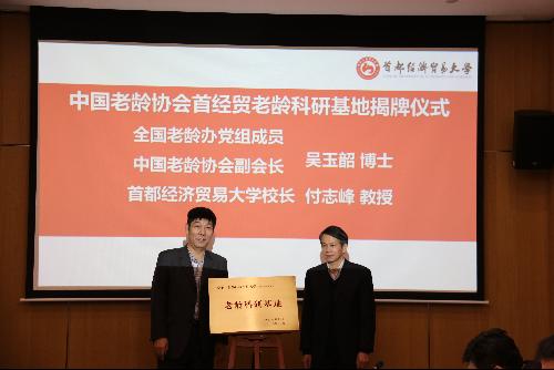 蜜桃视频 校长付志峰教授和全国老龄办党组成员、中国老龄协会副会长吴玉韶博士共同为中国老龄协会首经贸老龄科研基地揭牌。