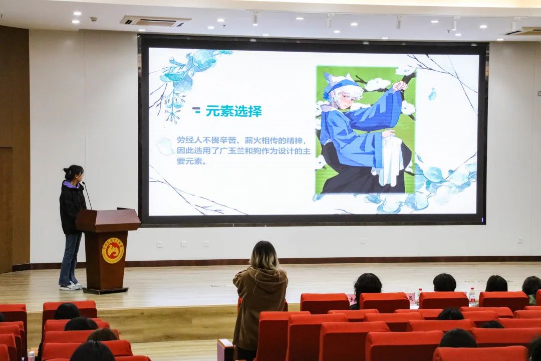 在主赛道的角逐中,参赛选手逐一介绍了自己作品的创作过程,解读各自作品的创作理念,他们将作品与学院生活相结合,设计出了独具特色的钥匙扣和文件夹,用作品表达对劳经精神的理解,用作品传递对劳经情怀的传承。