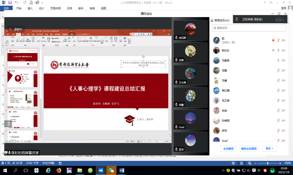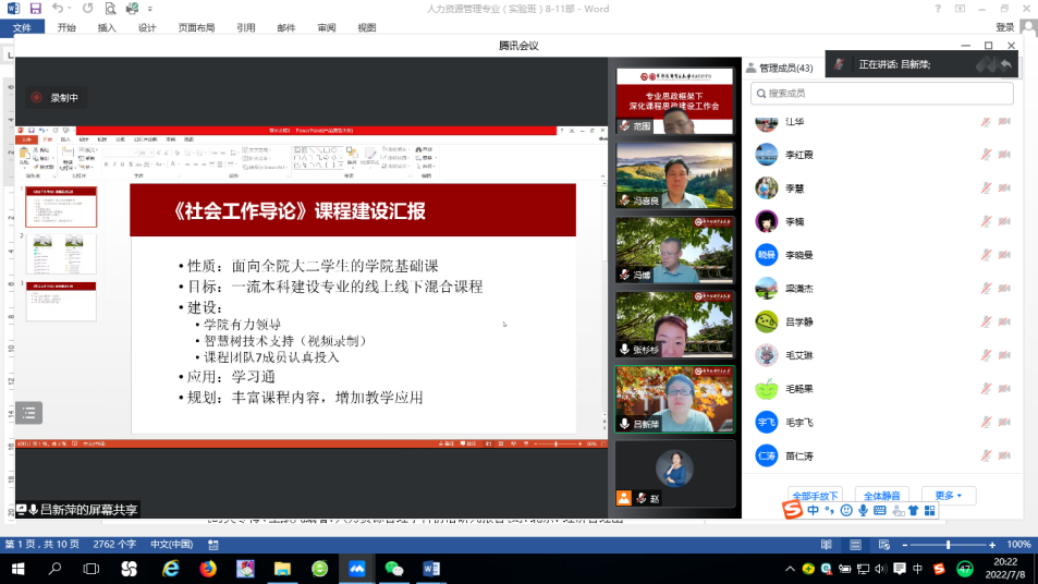 首先,由2021-2022学年承担学院在线课程建设项目的老师汇报课程建设的成效及其未来规划。张杉杉老师汇报《人力资源管理心理学》课程建设情况,该课程共计录制了50个教学视频,活动数达16586次,并修订教材第4版,形成308道题库,张杉杉老师最后提到学习通在线课程在与学生沟通、与老师之间沟通的便利作用。该课程的课件荣获北京市优质本科课件。吕新萍老师汇报《社会工作导论》课程的建设情况。课程主要围绕一流本科建设专业的线上线下混合课程的目标展开,在团队7人认真投入的情况下,丰富了课程内容。郑祁老师汇报《劳动关系学》课程的建设情况。课程总录制时长达550分钟,分为了59节,并分享了在线课程录制过程中将思政元素融会贯通的教学心得。周施恩老师汇报《人力资源管理导论》课程建设情况,并提出将思政元素融入课堂教学,形成蜜桃视频 特色交叉课程的未来展望,该课程荣获了北京市优质本科课程。江华老师汇报了《社会保障基金管理》混合金课建设的情况。该课程的整体定位为线上学知识,线下长能力。江老师以具体课程为例,详细介绍了如何将思政元素融入课堂,推进课程思政建设的经验。
