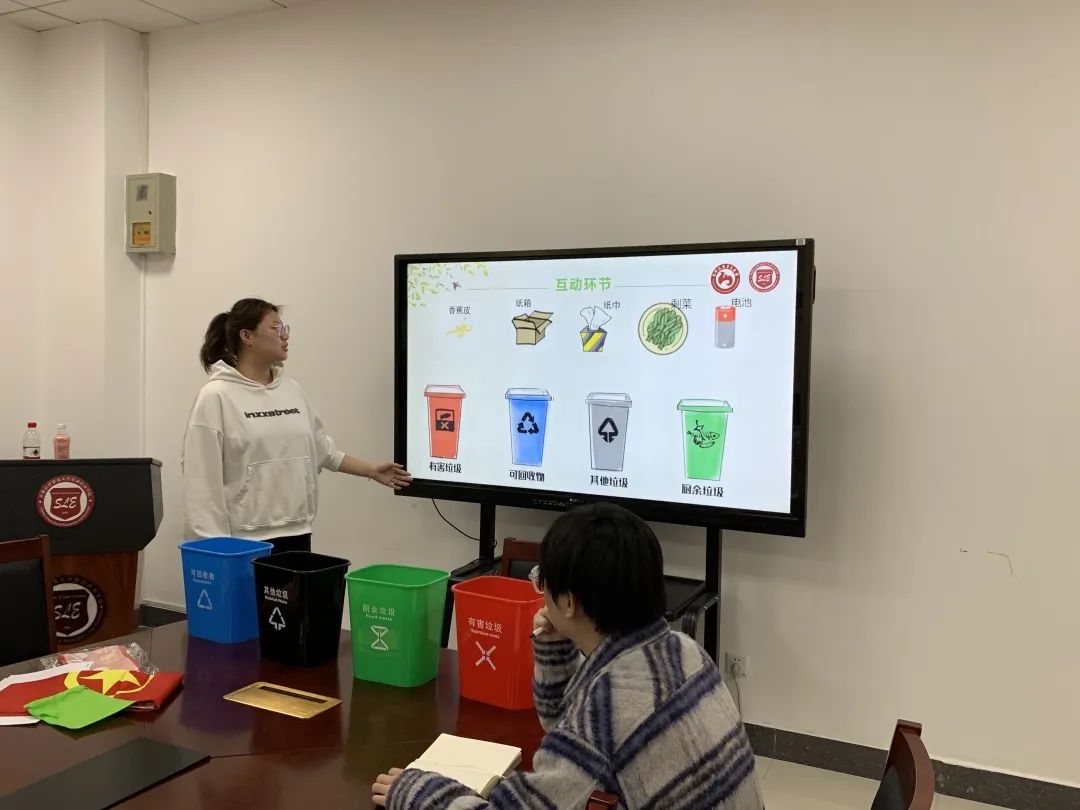 社区活动室内,由21级1班团支书王佳琛首先为小朋友们介绍垃圾分类的基本常识,他以亲切而生动的言语引导小朋友们思考,聚焦注意力。每当他抛出一个有关垃圾分类的问题时,在座的小朋友们都会迅速而踊跃地高高举起小手,有的小朋友甚至激动地站起身来,期待着能够上台分享自己的见解,积极的互动使得整场讲座的氛围轻松愉悦。