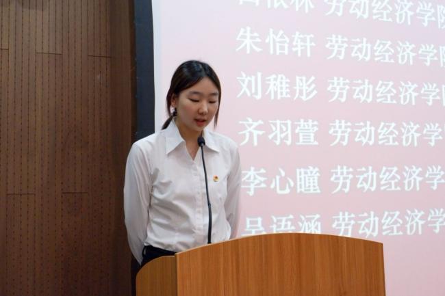 优秀团员代表、2022级劳动与社会保障班团支部田雨彤发言。她分享了加入共青团的意义与使命。她表示,新时代中国青年既要矢志创新创造,也要具备敢为人先的锐气,更应有上下求索的执着,让青春在创造中闪光。