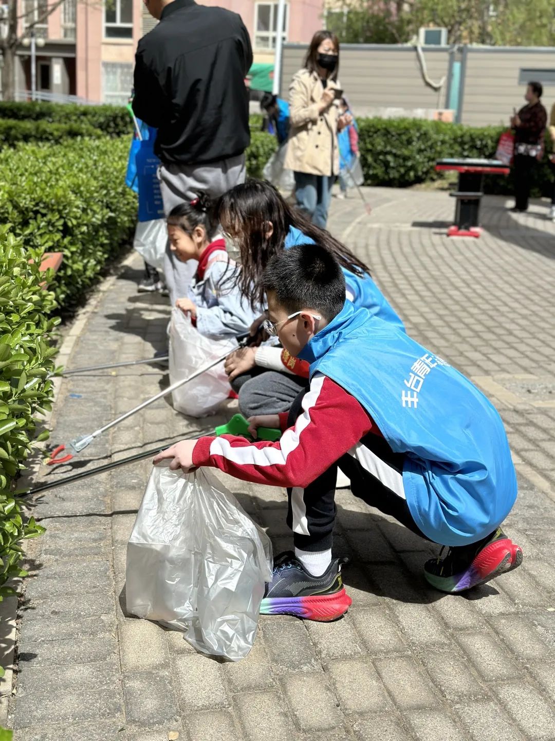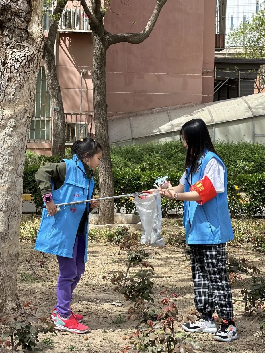 此外,同学们也积极带领小朋友参与到在室外社区环境维护当中,环节小朋友们他们穿上蓝色马甲,拿着专用的垃圾收集工具在志愿者的陪伴下,仔细清理和收集社区地面上掉落的垃圾。过程中他们一丝不苟,一次次的弯腰下蹲不放过任何角落的垃圾,被太阳晒得通红的小脸上洋溢着满足的笑容。小朋友们通过亲身体验和志愿者们的讲解明白了看似整洁的社区在不易察觉的地方也藏有垃圾,未来自己在不乱丢垃圾的同时也要帮助环卫工人做力所能及的事,为社区优美环境贡献自己微小的一份力量。