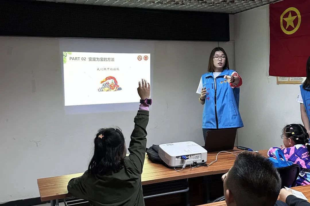 “变废为宝”创意环保课堂中,21级6六班团支书刘姝琪通过几组图片向小朋友们介绍了变废为宝的意义。在接下来的提问环节中,她亲切地和小朋友们进行互动,让小朋友在轻松愉悦的氛围中懂得了变废为宝不仅可以锻炼我们的想象力和动手能力,还可以使我们赖以生存的家园变得更美丽。