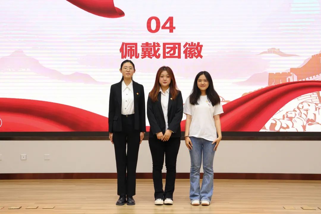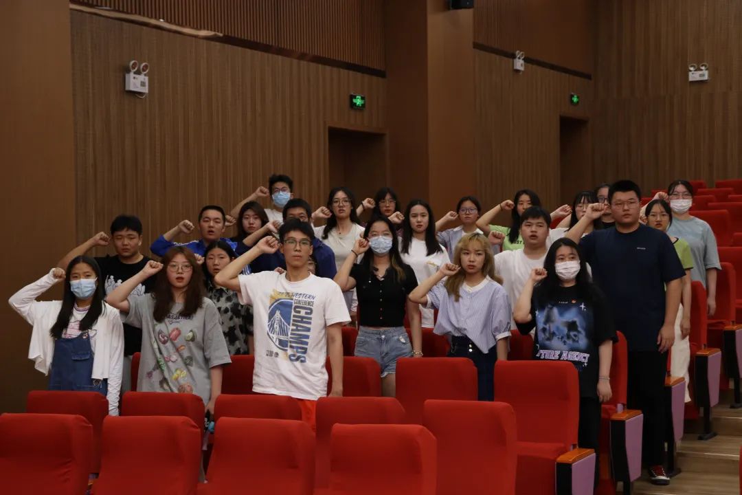 朱佳颖带领新老团员宣誓。在场新老团员一齐举手右拳在鲜艳的团旗下宣誓,激情澎湃,感受身为一名共青团员的荣誉感、使命感、自豪感。