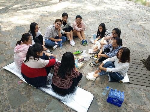 穿过风景秀丽的公园,我们找到了一片空地便开始了今天的趣味游戏和交流活动。为了组织这次的“破冰”活动,小伙伴们设计了7款不同的游戏。首先是“硬币凑钱”:所有参与者围成一个圆圈,女生每人代表5毛,男生每人代表1块。裁判说一个钱数,参与者自行组队达到要求的数则算赢,组错或者没队的参与者为输进行惩罚。第一轮比赛中,三个成员因没有成功组队成为遗漏人员,接受惩罚的他们给大家演唱了《小酒窝》,虽说有些跑调,但队员们的声音还算甜美。第二轮比赛中四个淘汰队员表演了四小天鹅,那场面也是相当有喜感。第三轮输掉比赛的倒霉孩子中给大家演唱了她们的班歌《一生有你》,抛开忘词、跑调不谈,还是不错的……